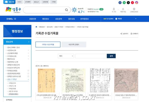 서울 성동구(구청장 정원오)가 지역의 풍부한 역사를 주민들과 함께 공유하기 위하여 구정역사 기록물에 대한 ‘기록정보 서비스'를 새롭게 선보인다고 밝혔다.