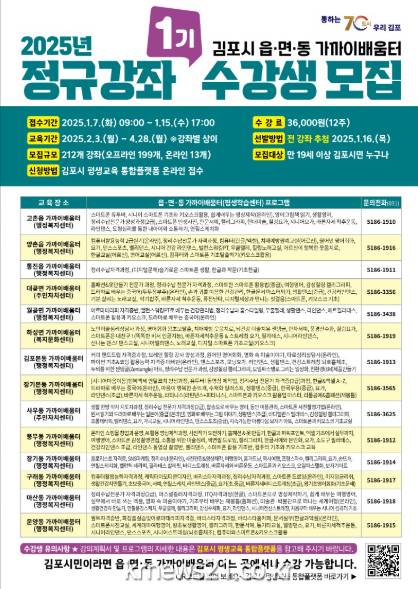 김포시(시장 김병수) 읍·면·동 가까이배움터(평생학습센터)는 김포시민에게 다양한 학습기회를 마련하여 누구나 누릴 수 있는 평생학습을 실현하기 위해 1월 7일(화)부터 1월 15일(수)까지 2025년 제1기 정규강좌 수강생을 모집한다.