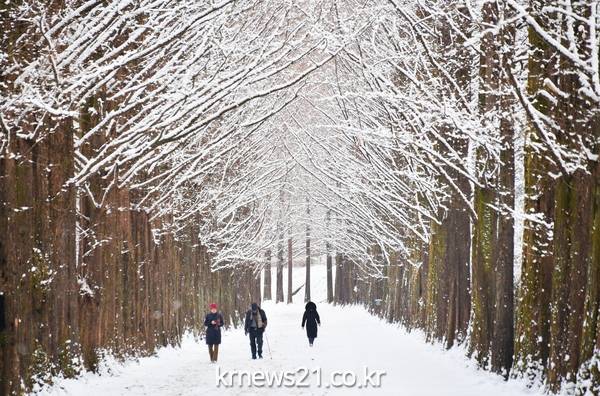 7일 관광객과 군민의 관광지이자 산책로로 사랑받고 있는 전남 담양군 관방제림과 메타세쿼이아길에 흰 눈이 쌓여 동화 같은 풍경을 연출하고 있다.