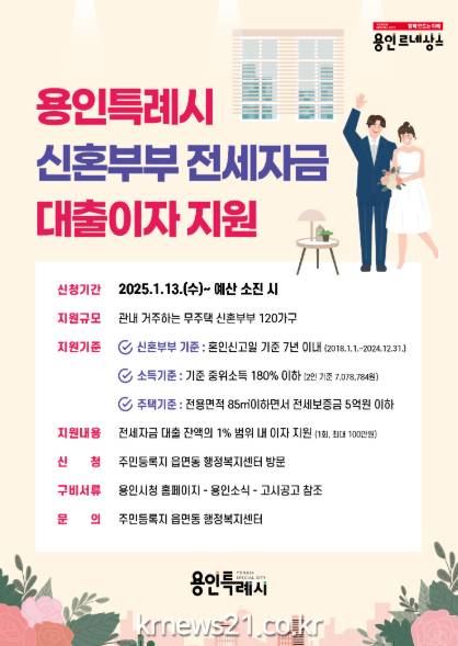▲ 사진=용인시용인특례시(시장 이상일)는 결혼한 지 7년 이내 무주택 신혼부부의 주거 안정을 돕기 위해 최대 100만원의 전세자금 대출이자를 지원키로 하고 13일부터 31일까지 총 120쌍을 모집한다고 9일 밝혔다.