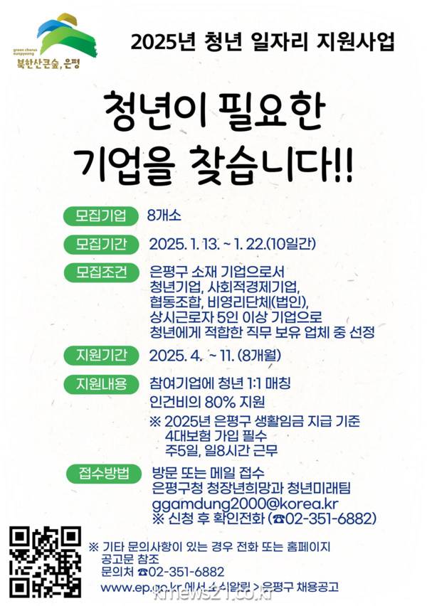 ▲ 사진=은평구은평구(구청장 김미경)는 청년 구직난 해소를 위해 ‘2025년 청년 일자리사업’에 참여할 기업 또는 단체를 모집한다고 밝혔다.