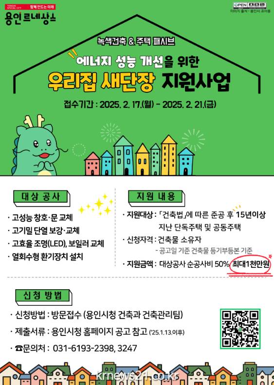 신청을 원하는 건축물 소유자는 공사업체와 계약 등을 마친 뒤 신청서와 구비서류를 지참해 2월 17일부터 시 건축과로 방문 접수하면 된다. 자세한 안내 사항은 시 홈페이지(www.yongin.go.kr)에서 확인할 수 있다.