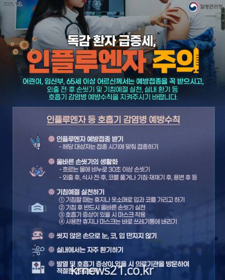 인플루엔자 감염은 전국 1월 1주차(12월29~1월4일) 표본 감시 결과 1,000명 당 99.8명으로 2016년 이래 최고 수준으로 발생하고 있어 65세 이상, 어린이, 면역저하자 등에게 신속한 백신접종이 필요하다.