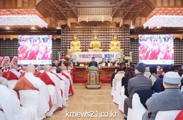 강수현 양주시장이 지난 19일 관내 장흥면에 소재한 청련사에서 열린 ‘수봉상진 법어집’ 봉정식에 참석해 축하의 메시지를 전했다.