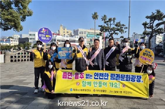 ▲ 사진=제주시 제주보건소는 지난 21일 탐라문화광장에서 자치경찰단과 합동으로 금연·금주 구역 홍보 및 금연·절주 캠페인을 전개했다.