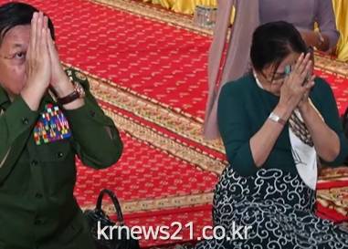 ▲ 사진=KBS NEWS 영상 캡처사원을 찾은 미얀마 군부 수장 민 아웅 흘라잉 최고사령관과 부인 규규흘라.