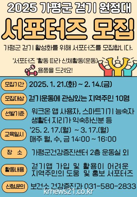 가평군보건소 관계자는 “걷기원정대 서포터즈 활동을 통해 주민들이 건강한 걷기문화를 실천하고, 삶의 질을 높이는 데 기여할 수 있을 것으로 기대한다”며 주민들의 적극적인 관심과 참여를 당부했다.
