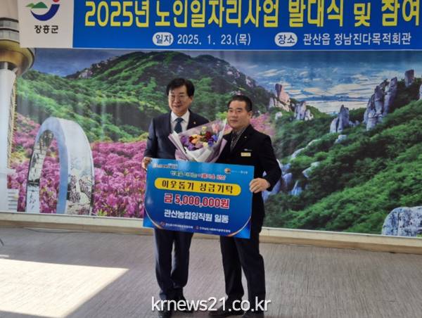 ▲ 사진=장흥군장흥군 관산농업협동조합(조합장 오형주) 임직원은 지난 23일 이웃돕기 성금 500만원을 관산읍 행정복지센터에 전달했다.