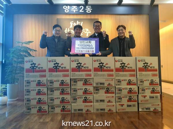 ▲ 사진=양주시청양주시 양주2동(동장 백기철)이 지난 5일 관내 고읍동에 소재한 ‘열린교회(목사 백광희)’에서 어려운 이웃에게 전달해달라며 라면 30박스(환가액 60만 원 상당)를 기부했다고 밝혔다.