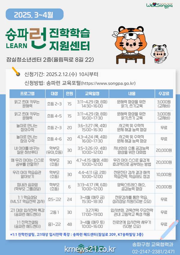 프로그램 참여는 선착순으로, 송파런 교육포털에서 온라인 신청하면 된다. 교육은 잠실청소년센터(올림픽로8길 22) 2층에 자리한 송파런 진학학습지원센터와 송파런헤드센터(송파KT 3층)에서 진행된다.