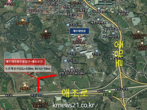 이번 사업은 제주대학교병원 후문에서 애조로(죽성교차로)를 연결하는 연장 320m, 폭 12~15m 규모의 도시계획도로를 개설하는 사업으로, 총사업비 35억 원(보상 23억 원, 공사 12억 원)을 투입해 2023년 5월 착공한 후 올해 2월 사업을 마무리했다.
