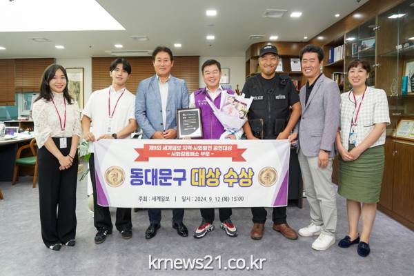 ▲ 사진=동대문구서울 동대문구(구청장 이필형)가 12일 한국프레스센터에서 열린 ‘제9회 세계일보 지역·사회발전 공헌대상 시상식’에서 사회갈등해소 부문 대상을 수상했다.