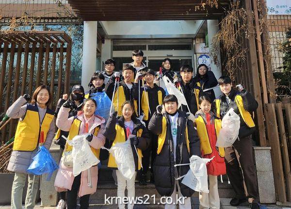 ▲ 사진=송파구청송파구(구청장 서강석)는 방이1동 청소년들로 구성된 봉사단 ‘방방꼭꼭’을 구성하고 겨울방학을 이용해 우리동네 지킴이 봉사활동을 하고 있다고 25일 밝혔다.