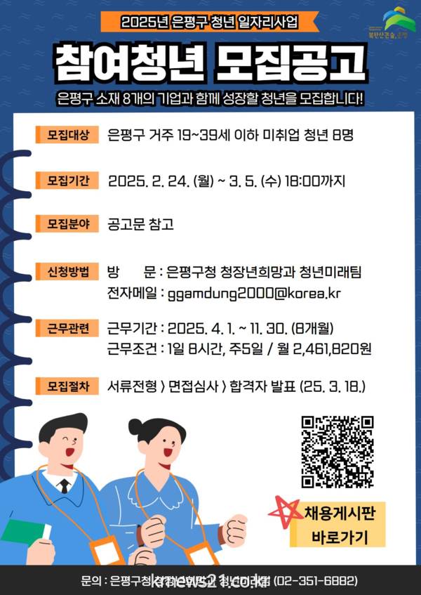 선발된 청년은 관내 기업에서 오는 4월 1일부터 11월 30일까지 8개월 간 근무하며 2025년 은평구 생활임금인 월 2,461,820원의 급여와 4대 보험, 직무역량강화 교육 등을 지원받는다.