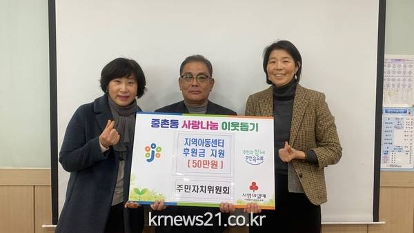 ▲ 사진=대전중구대전 중구 중촌동(동장 김효숙)은 지난 26일 주민자치위원회(위원장 이영근)에서 중촌동 지역아동센터 '꿈꾸는 아이들'(센터장 유은주)에 후원금 50만 원을 전달했다고 밝혔다.