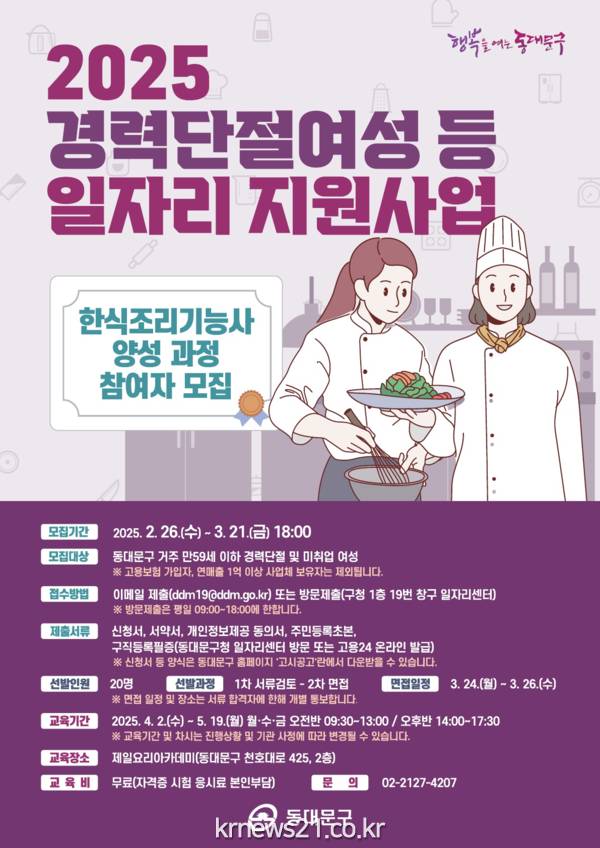구는 미취업 여성의 취업 기회 확대를 위해 연 2회 ‘경력단절여성 등 일자리 지원사업’을 운영하고 있다. 이번 과정에서는 국가기술자격증인 한식조리기능사 교육을 무료로 제공하며, 자격증 응시료는 본인 부담이다. 또한 수료자에게는 관련 분야 정보를 제공해 취업 연계를 지원한다.