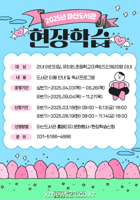 김포시 마산도서관(시장 김병수)은 2025년 어린이 현장학습을 4월 3일부터 관내 어린이집, 유치원, 초등학교(저학년)를 대상으로 운영한다.