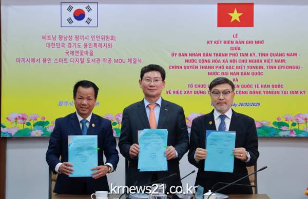 이상일 용인특례시장은 26일(현지 시각) 오후 꽝남성의 성도인 땀끼시를 방문해 시가 ODA(공적개발원조, Official Development Assistance) 사업으로 건립을 지원한 ‘용인 스마트 디지털도서관’ 건립 MOU를 땀끼시 측과 체결하고, 땀끼시 국제연꽃마을 복합 교육복지센터에서 열린 도서관 기공식에 참석해 축하했다.