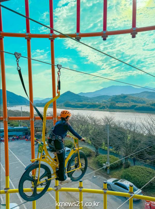 ▲ 사진=구례군청문척면 오섬 관광 권역 주차장에 있는 ‘섬진강 스카이바이크 체험시설’이 3월 1일 정식 개장한다.