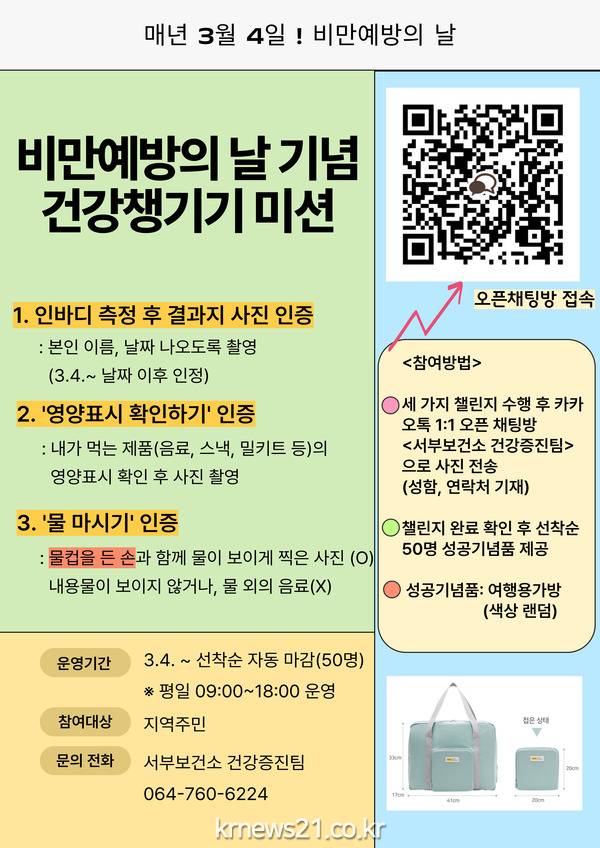 서부보건소는 3월 4일부터 <비만예방의 날 기념 건강챙기기 미션>을 수행하는 챌린지를 진행하며, 총 세 가지의 미션 ▲인바디 측정 후 결과지 사진 인증 ▲‘영양표시 확인하기’▲하루 적당량의 물 마시기를 달성한 선착순 50명에게 소정의 상품이 제공된다. 참여 방법은 카카오톡 오픈 채팅방 ‘서부보건소 건강증진팀’을 통해 가능하며 지역주민 누구나 참여할 수 있다.