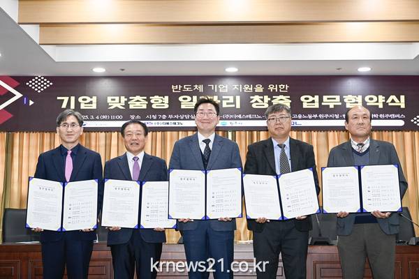 ▲ 사진=원주시원주시는 3월 4일(화) 시청 7층 투자상담실에서 ㈜디에스테크노, ㈜지큐엘, 한국폴리텍대학 원주캠퍼스, 고용노동부 원주지청과 함께 반도체 기업 지원을 위한 ‘기업 맞춤형 일자리 창출’ 업무협약을 체결했다.