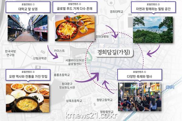 ‘경희담길’은 ‘경희+이야기가 흐르는 거리’라는 뜻으로, 오랜 역사를 지닌 경희대 앞 상권의 청춘 감성을 반영해 붙여진 이름이다. 이곳은 문화·미식·관광이 어우러진 지역으로 청년과 외국인이 함께 어울리는 활기찬 분위기를 자랑한다.