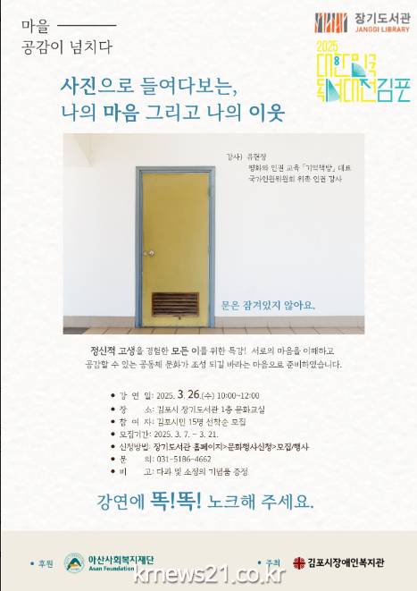 ▲ 사진=김포시김포시(시장 김병수) 장기도서관은 김포시장애인복지관과 함께 ‘사진으로 들여다보는 나의 마음 그리고 나의 이웃’과정를 오는 3월 26일 수요일 오전 10시부터 12시까지 장기도서관 문화교실에서 운영한다.