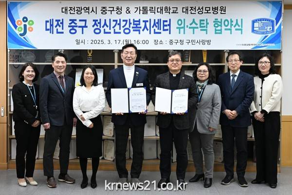 이번 계약은 기존 위수탁 계약이 2025년 3월 만료됨에 따라 진행된 공개모집 절차를 통해 이뤄졌다. 대전성모병원은 2023년부터 중구 정신건강복지센터 운영을 맡아온 경험을 바탕으로 재신청하였으며, 심의 절차를 거쳐 2030년까지의 수탁기관으로 재선정됐다.대전성모병원은 이번 계약으로 2030년까지 중구 정신건강복지센터에서 ▲중증 정신질환자 관리 ▲아동·청소년 및 지역사회 정신건강 증진 ▲자살 예방 및 생명존중 문화 조성 등 지역사회 정신건강을 위한 다양한 사업을 수행할 예정이다.또한, 올해 하반기부터는 자살 유족 원스톱 서비스 지원사업도 추진하여 지역 내 자살 문제 해결과 예방에 집중할 방침이다.김제선 중구청장은 “사회·경제적 어려움 등으로 인해 정신건강 문제를 겪는 주민들이 많아지고 있다.”라며 “이번 위수탁 계약을 통해 중구 정신건강복지센터가 구민들의 마음 건강을 지키는 든든한 버팀목이 될 수 있도록 최선을 다하겠다.”라고 말했다.한편, 중구는 2012년부터 민간 전문기관에 정신건강복지센터 운영을 위탁해 전문성과 효율성을 강화하고, 주민들의 정신적 어려움에 적극적으로 대응하고 있다.<사진설명: 지난 17일 중구청에서 대전성모병원과 진행한 정신건강복지센터 위수탁 계약 체결 기념사진>담당자: 건강증진과 이은혜 주무관(042-288-8164)