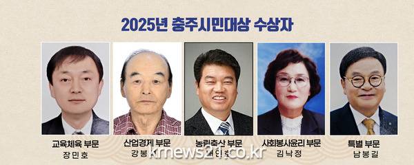 충주시가 지역사회 발전에 공헌한 시민을 선정하는 ‘2025년 충주시민대상’ 수상자를 발표했다.시는 공적심사위원회를 통해 △교육·체육 부문 장민호(남, 57세) 前목련장학회장 △산업・경제부문 강봉석(남, 83세) 前 강봉석조청(주) 대표 △농림・축산부문 배인호(남,・60세) (사)한국쌀전업농충주시연합회 회장, △사회・봉사・윤리부문 김낙정(여,・73세) 前 충주시자원봉사센터장 △특별부문 남봉길(남·78세) ㈜한국팜비오 회장 등 총 5명을 수상자로 선정했다고 19일 밝혔다.장민호 前 목련장학회장은 33년 동안 장학회 회장으로 봉사하며 지역인재 양성에 기여한 공로를 인정받았다.강봉석 前 강봉석조청㈜ 대표는 지속적인 연구개발과 기술혁신으로 지역경제와 농가소득 향상에 기여한 점이 높이 평가 됐다.배인호 (사)한국쌀전업농충주시연합회 회장은 고품질 벼 재배 확대에 선도적인 역할과 쌀전업농의 교육 및 위상 제고에 힘쓴 공로를 인정받았다.김낙정 前 충주시자원봉사센터장은 충주시 자원봉사활동 활성화 및 충주시 여성 권익 신장 활동에 기여한 공로를 높이 평가받았다.남봉길 ㈜한국팜비오 회장은 충주지역 일자리 창출 기여 및 동반성장, 사회적 가치 실현의 공로를 인정받아 특별부문 수상자로 선정됐다.조길형 충주시장은 “충주시민대상 수상자들은 각자의 자리에서 헌신하며 충주의 발전과 시민 행복을 위해 큰 기여를 해왔다”며, “이분들의 노력과 공로가 더욱 빛을 발할 수 있도록 시에서도 적극적인 지원을 아끼지 않겠다”고 말했다.한편, 충주시민대상은 시민의 귀감이 되고, 지역발전과 시민 화합을 위해 노력하며 충주를 빛낸 시민을 찾아 감사의 마음을 전하기 위해 추진되는 상이다.올해 시상식은 오는 4월 23일 충주탄금공원에서 열리는 ‘충주의 날’ 기념행사에서 진행될 예정이다.