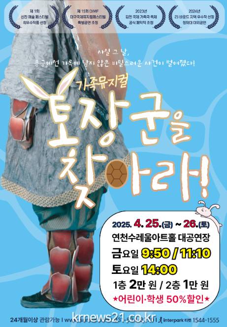 ▲ 사진=연천군청연천수레울아트홀은 어린이날을 맞아 기획한 가족뮤지컬 <</span>토장군을 찾아라!>를 4월 25일(금) 오전 9시 50분과 11시 10분, 4월 26일(토) 오후 2시에 총 세 차례 공연한다.