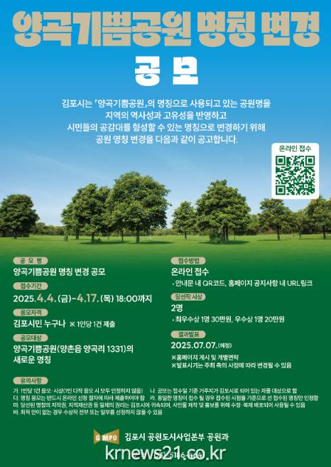 ▲  사진=김포시청김포시(시장 김병수)는 양촌읍에 위치한 ‘양곡기쁨공원’의 명칭을 변경하기 위해 시민 공모를 실시한다. 이는 기존 명칭이 일부 부정적인 이미지를 연상시킨다는 여론에 따라, 지역의 역사와 고유성을 반영하고 시민들이 공감할 수 있는 새로운 이름을 찾기 위해 추진된다.