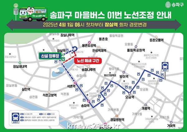 이번에 노선조정 노선은 오륜사거리~오금동~송파2동~석촌역~잠실역?송파구청을 순환 운행하는 마을버스 송파 01번 대상이다.