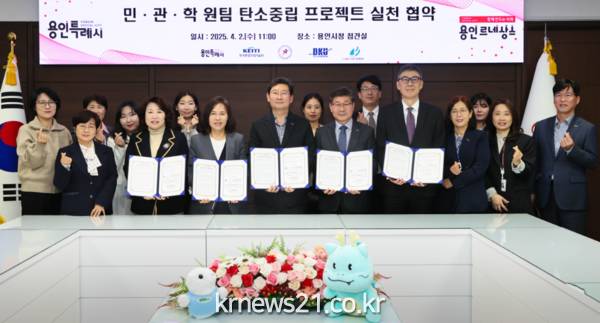 ▲ 사진=용인특례시용인특례시(시장 이상일)는 2일 시장 접견실에서 한국환경산업기술원, 용인교육지원청, 단국대학교, (사)용인시어린이집연합회와 ‘민·관·학+ 원팀 탄소중립 프로젝트 실천 협약’을 체결했다고 밝혔다.