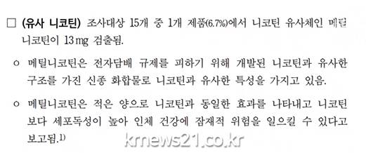 또, 무(無)니코틴이라고 표시한 7개 제품과 니코틴 표시가 없는 2개 제품에서도 니코틴이 최고 158mg 검출됐다고 발표했다.