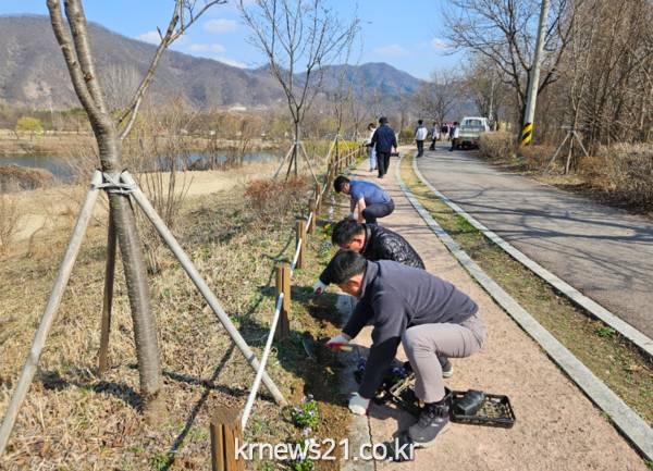 ▲ 사진=가평군가평군 하수도사업소는 위탁운영사 ㈜파이닉스알엔디와 함께 가평공공하수처리시설 주변 산책로를 중심으로 꽃 식재 행사를 열고 환경 정비에 나섰다고 7일 밝혔다.