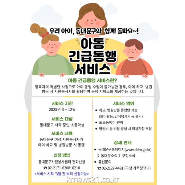 ▲ 사진=동대문구청서울 동대문구(구청장 이필형, 이하 ‘구’)가 아동 양육 가정의 부담을 덜기 위해 올해도 ‘아동긴급동행서비스’를 운영한다.