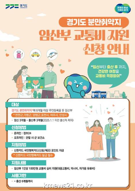 지원 금액은 임산부 1인당 최대 100만원이며, 대중교통, 택시, 자가용 유류비 등으로 사용할 수 있는 카드 포인트 형태로 제공된다.