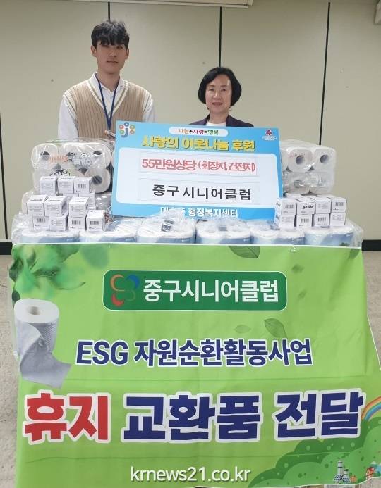 ▲ 사진=대전중구대전 중구 대흥동(동장 최은)은 지난 14일 중구시니어클럽(관장 최종대)에서 어려운 이웃을 위해 55만 원 상당의 생활용품(화장지, 건전지)을 기탁했다고 밝혔다.