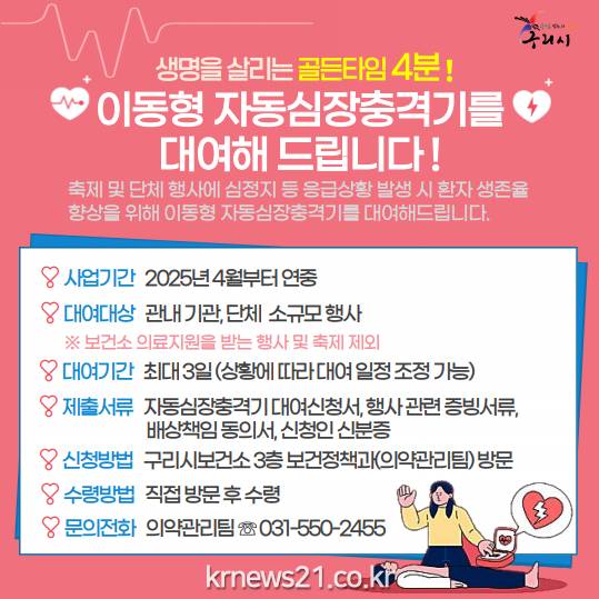 시에 따르면, 시민들의 안전을 확보하고 응급상황 발생 시 신속하게 대처할 수 있도록 지역 내 기관, 단체나 개인이 추진하는 소규모 행사를 대상으로 이동형 자동심장충격기를 무상으로 최대 3일간 대여한다.예고 없이 발생하는 심정지는 초기 대응이 매우 중요하기에, 지역 내 소규모 축제나 행사 등 많은 사람이 모이는 장소에서 심정지 환자가 발생할 경우 자동심장충격기 사용을 통한 신속한 응급처치로 생명을 살림으로써 시민들의 안전을 강화하는 데 기여할 것으로 기대된다.자동심장충격기의 대여를 원하는 사람은 구리시보건소 3층 보건정책과로 방문하여 신청하면 되며, 이와 관련한 사항은 의약관리팀(031-550-2455)으로 문의하면 된다.백경현 구리시장은 “이번 이동형 자동심장충격기 무상대여 사업을 통해 시민들이 더욱 안전하게 행사를 즐길 수 있도록 지원하고, 응급상황 발생 시 신속하게 대처하여 소중한 생명을 지키는 데 기여하겠다.”라며, “앞으로도 시민들의 안전과 건강을 위해 다양한 사업을 추진해 나갈 것”이라고 밝혔다.한편, 구리시보건소는 시가 주관·주최하는 200명 이상 규모의 축제나 행사에는 구급 차량과 응급구조사 등의 의료지원을 제공하며, 시민들의 생활 안전 강화에 앞장서고 있다.