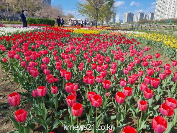 ▲ 사진=동대문구서울 동대문구(구청장 이필형, 이하 ‘구’)는 중랑천 장평교 하부 둔치에 조성된 ‘사계정원’의 튤립이 본격적으로 개화함에 따라, 봄꽃을 즐기려는 시민들을 맞이할 준비를 마쳤다고 21일 밝혔다.