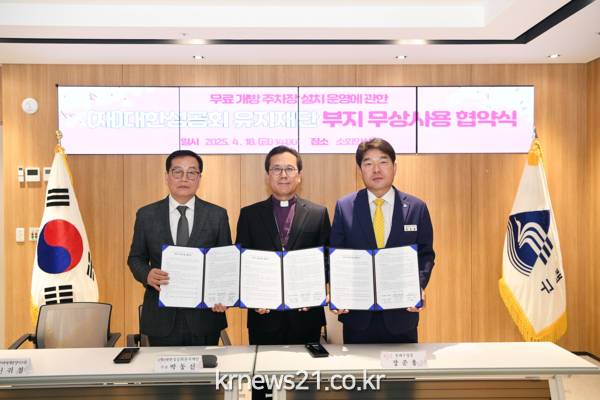 ▲ 사진=부산동래구부산 동래구(구청장 장준용)는 지난 18일 (재)대한성공회유지재단 부산교구(주교 박동신), 온천4구역 주택재개발정비조합(조합장 신귀철)과‘무료 개방 주차장 설치·운영에 관한 부지 무상사용' 업무 협약을 체결했다고 밝혔다.