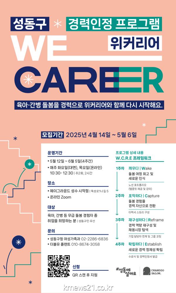 서울 성동구(구청장 정원오)는 돌봄활동으로 인한 경력단절 경험을 사회적 자산으로 전환하고 재도약의 기회를 제공하기 위한 경력인정프로그램 ‘위커리어(WeCareer)’를 운영한다.
