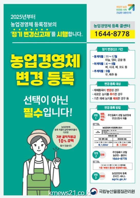 하지만 바쁜 영농활동과 의무에 대한 인식 부족 등으로 농업인이 제때 변경등록을 하지 않고 있어 지원 사업에서 배제되는 등의 불이익을 받을 우려가 있다.