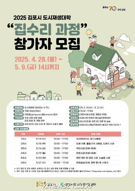 김포시(시장 김병수)는 오는 28일부터 ‘2025년 김포시 도시재생대학 집수리 과정’ 수강생을 모집한다고 밝혔다.