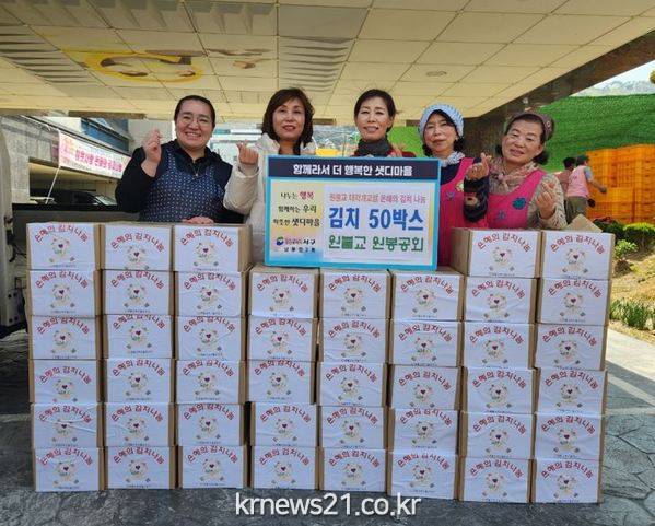 ▲ 사진=부산서구원불교 원봉공회(회장 고화중)에서 대각개교절을 맞아, 4월 10일 남부민2동 지역사회보장협의체(위원장 배찬식)에 김치 50박스를 전달하였다.