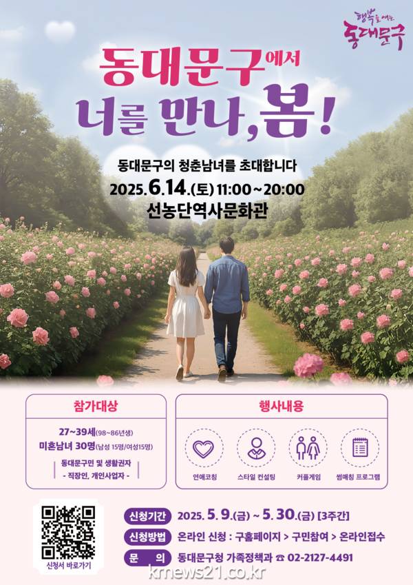 모집 인원은 남녀 각 15명씩 총 30명이며, 참가 대상은 동대문구 거주자 또는 생활권자 중 만 27세(1998년생)~만 39세(1986년생) 미혼 남녀다. 신청 기간은 5월 9일(금) 오전 9시부터 5월 30일(금) 오후 6시까지이며, 네이버 신청 링크 또는 동대문구 누리집(구민 참여 → 온라인 접수)을 통해 신청할 수 있다.