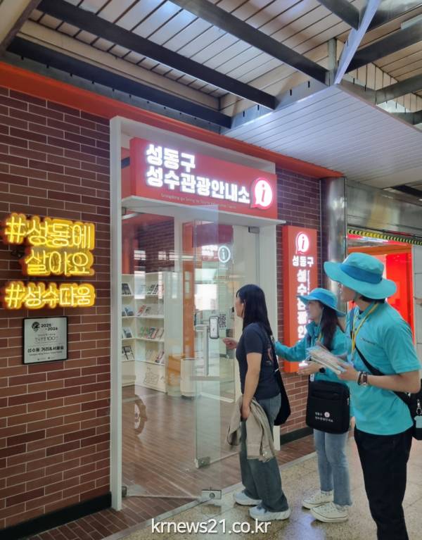 서울 성동구(구청장 정원오)의 성수동 거리가 ‘한국관광 100선’에 최초 선정됨에 따라 성수관광안내소에 현판을 새롭게 부착했다고 밝혔다.