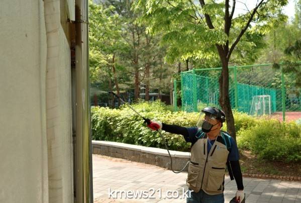 수지구보건소는 공원 내 감염병 매개체인 모기가 발생하는 것을 차단하고자 유충 구제와 함께 8월 말까지 매달 1회씩 성충 대상 잔류분무 소독을 한다.