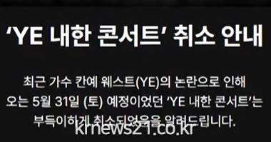 공연의 주최사는 어제 공식 입장문을 내고 칸예 웨스트에 관한 논란으로 인해 오는 31일 예정됐던 그의 콘서트를 부득이하게 취소한다고 알렸다.