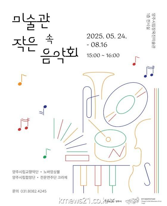 ‘미술관 속 작은 음악회’는 모두 무료로 진행되며 공연 당일에는 ‘양주시립장욱진미술관’ 전시 관람도 무료 개방된다.